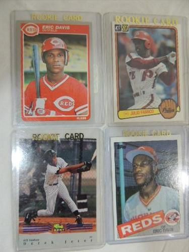 LOT 4 BASEBALL ROOKIE CARDS: CLASSIC - DEREK JETER, TOPPS - ERIC DAVIS, DONRUSS - JULIO FRANCO & FLEER - ERIC DAVIS. AS SHOWN. VIEW PICTURE FOR DETAIL.