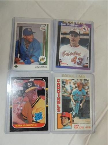 LOT 4 BASEBALL ROOKIE CARDS: DONRUSS - MARKMCGWIRE, TOPPS - AND VAN SLYKE, DONRUSS CURT SCHILLING & UPPER DECK - GARY SHEFFIELD. AS SHOWN. VIEW PICTURE FOR DETAIL.