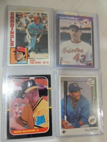 LOT 4 BASEBALL ROOKIE CARDS: DONRUSS - MARKMCGWIRE, TOPPS - AND VAN SLYKE, DONRUSS CURT SCHILLING & UPPER DECK - GARY SHEFFIELD. AS SHOWN. VIEW PICTURE FOR DETAIL.