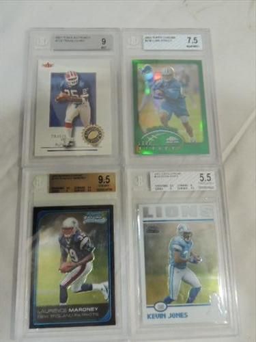 LOT 4 BECKETT GRADED FOOTBALL CARDS: 2006 BOWMAN #270, 2004 TOPPS #185, 2002 TOPPS #236 & 2001 FLEER #119. AS SHOWN. VIEW PICTURE FOR DETAIL.