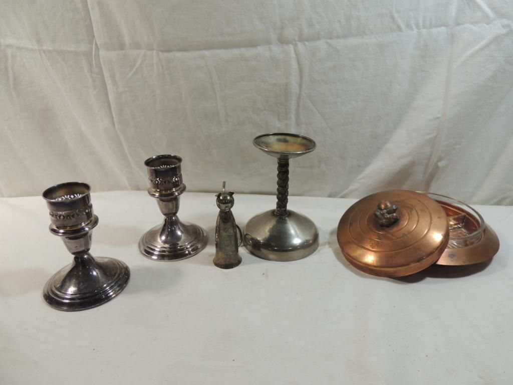 PAIR OF CANDLE HOLDERS. CANDY DISH WITH LID. CANDLE SNUFFER. AS SHOWN. SEE PHOTO FOR MORE DETAILS.