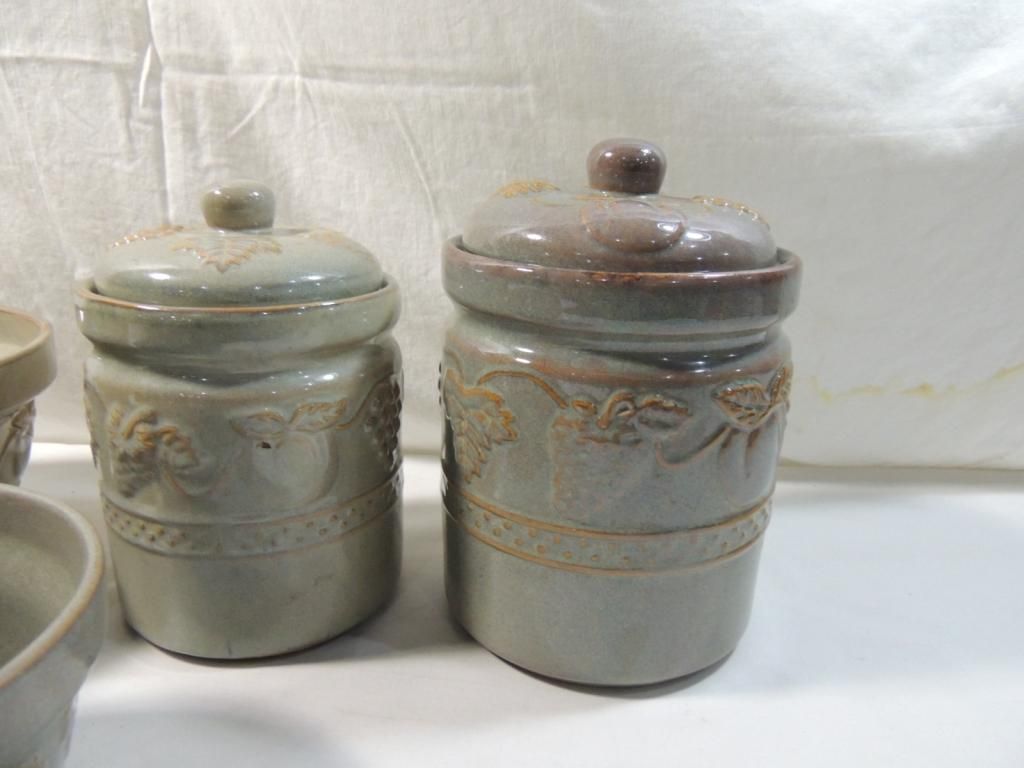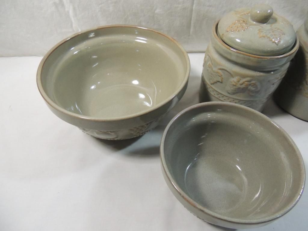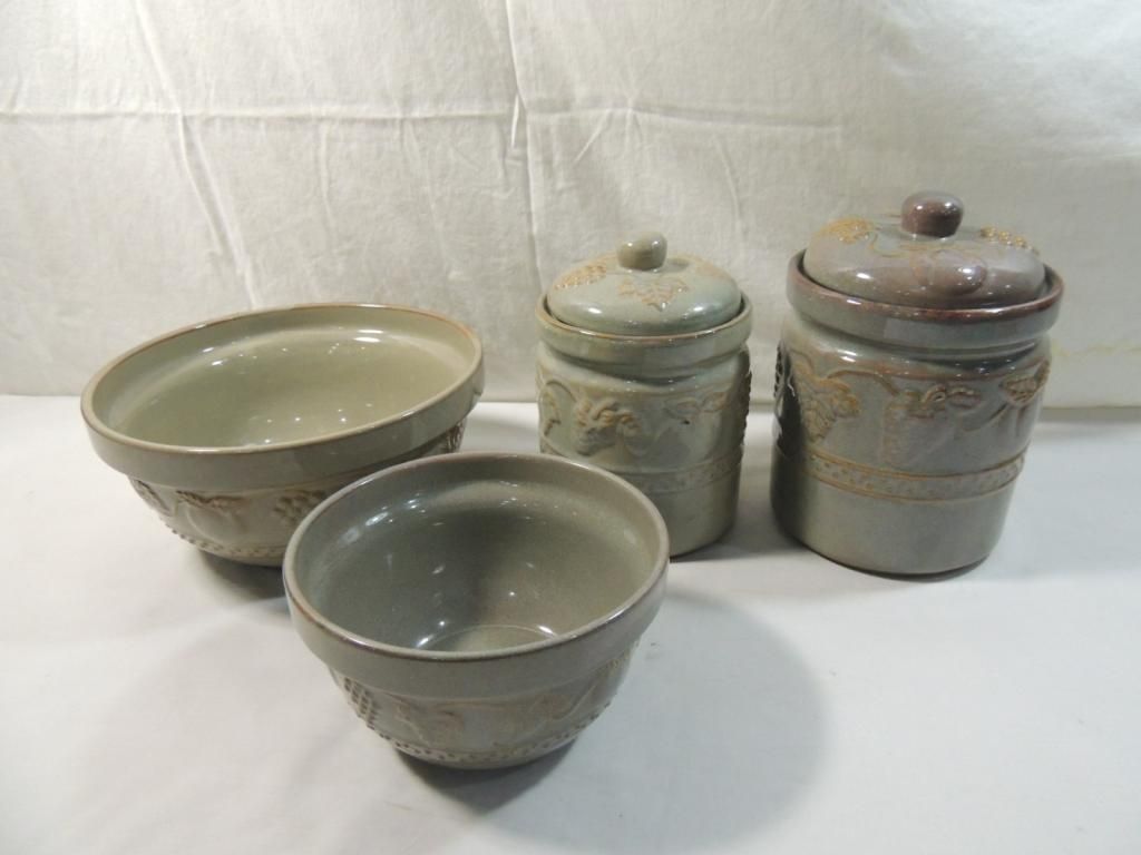 DECORATIVE MIXING BOWLS CERAMIC POTTERY CANISTERS GRAPES, LEAVES, APPLES, BROWN BLUE AS SHOWN SEE PHOTO FOR MORE DETAILS.
