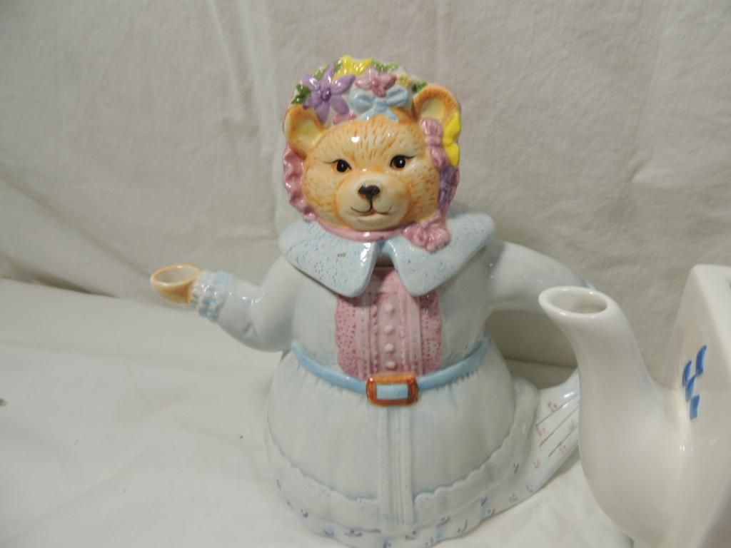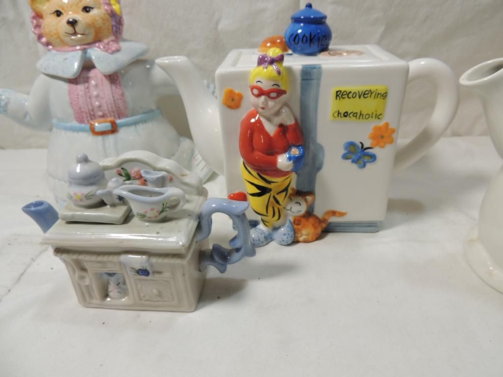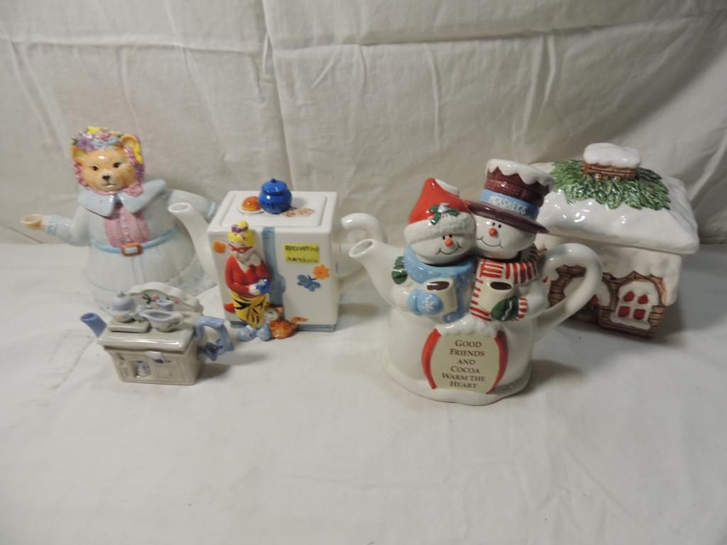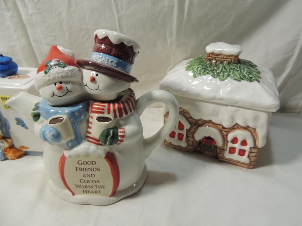 SNOWMAN HOT COCOA POT, BEAR LADY CERAMIC POT, RECOVERING CHOCAHOLIC CERAMIC POT, SNOW COVERED HOUSE COOKIE JAR, COCA JAR. AS SHOWN. SEE PHOTO FOR MORE DETAILS.