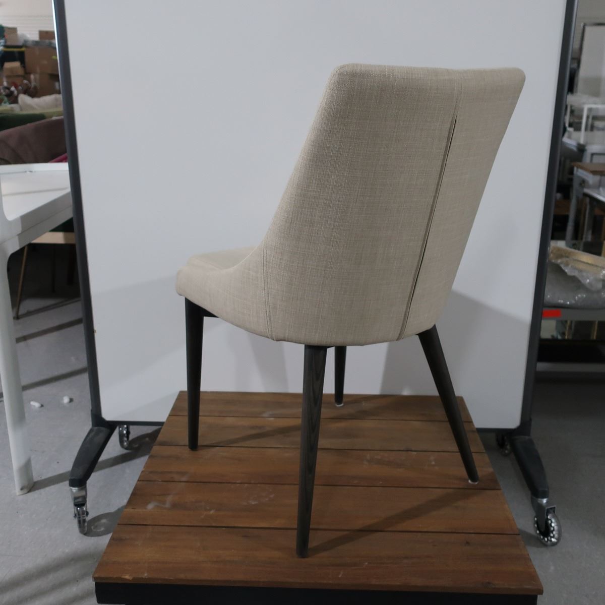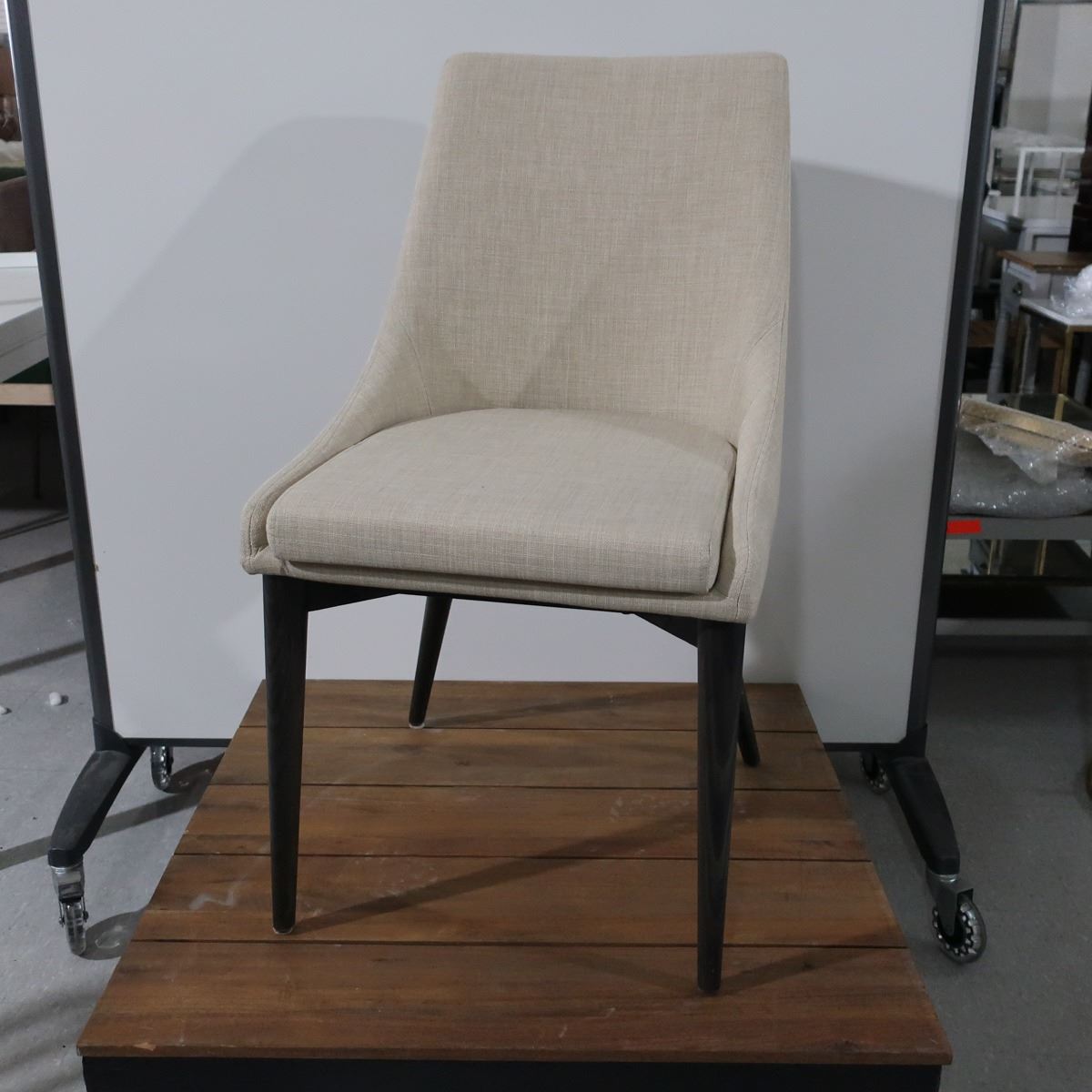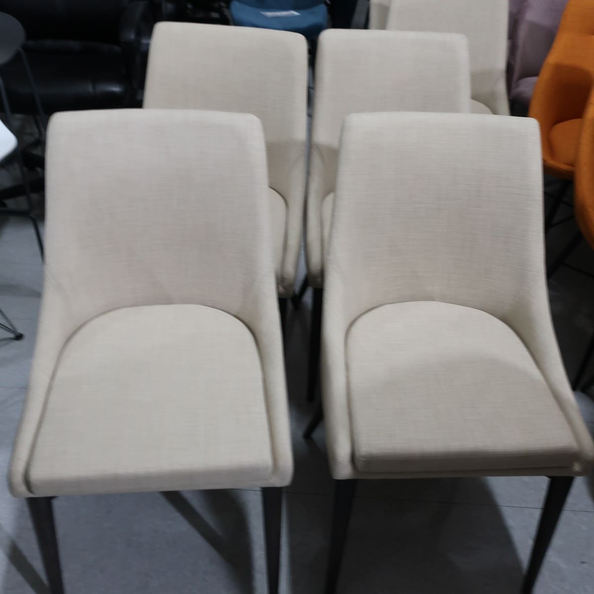 LOT: 4 CHAIRS, BEIGE FABRIC, WOOD BASE