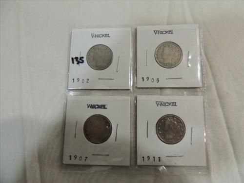 LOT 4 CIRCULATED V-NICKELS: 1902, 05, 07, 11. AS SHOWN. VIEW PICTURE FOR DETAIL.