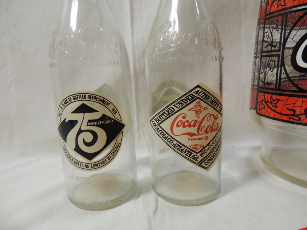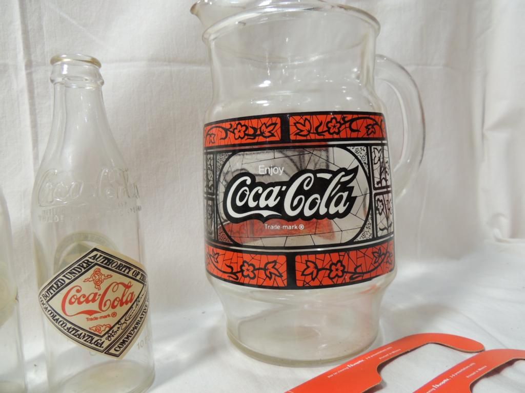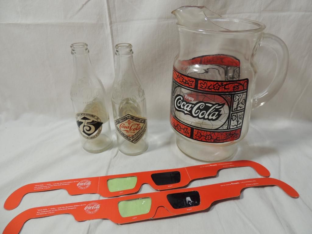 2 COCA COLA 75TH ANNIVERSARY BOTTLE. COCA COLA PITCHER GLASS PITCHER. COCA COLA 3D GLASSES. COLLECTIBLE. AS SHOWN. SEE PHOTO FOR MORE DETAILS.