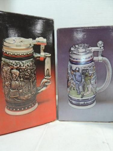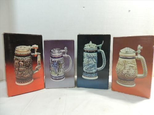 LOT 4 COLLECTIBLE AVON CERAMIC TOPICAL BEER STEINS: CAR CLASSIC, FLYING CLASSIC, IRON HORSE & BASEBALL. AS SHOWN. VIEW PICTURE FOR DETAIL.