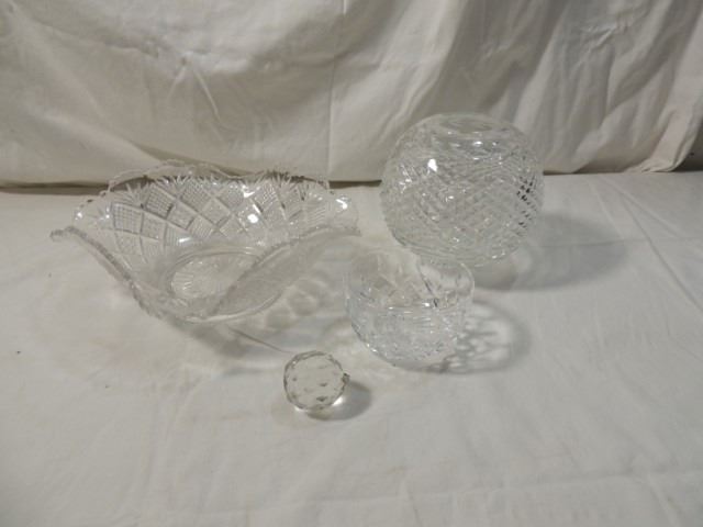 4 NICE PIECES OF PRESSED OR CUT GLASS. ROSE STYLE VASE OR BOWL MEASURES 6" DIAMETER AND 6" TALL. NICE FLUTED SERVING OR CANDY DISH. SMALL DISH. SINGLE SMALL CHANDELIER ROUND PRISM. AS SHOWN. ALL FOR ONE MONEY.