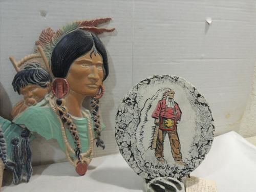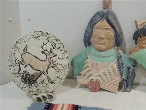 LOT 4 DECORATIVE NATIVE AMERICAN CERAMICS & 1 WOOL WALL HANGER. AS SHOWN. VIE WPICTURE FOR DETAIL.