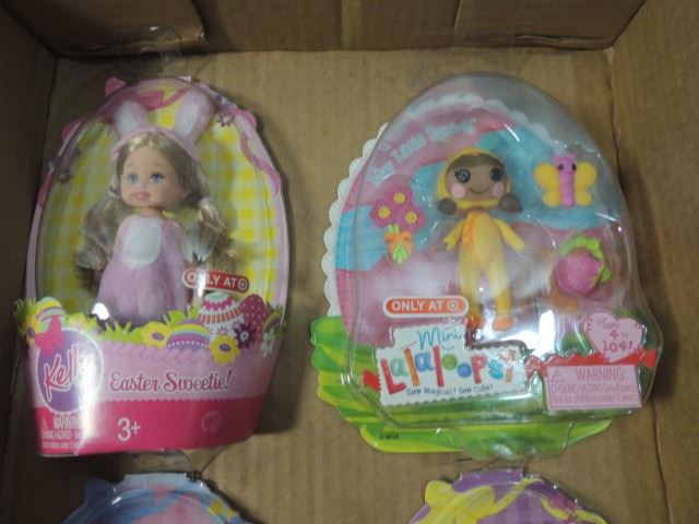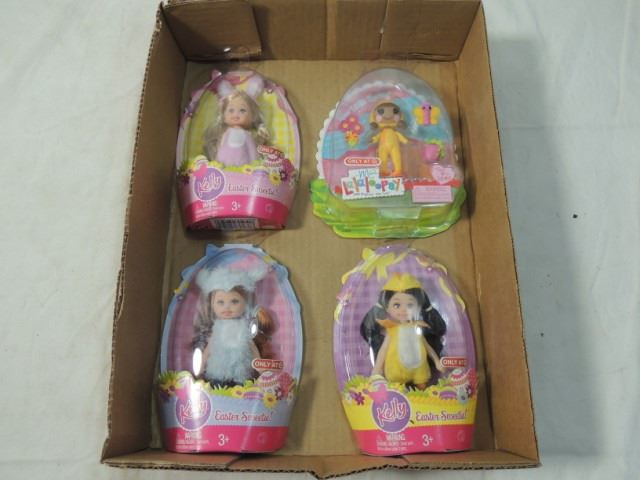 3 KELLY MINI DOLLS IN PACKAGES, AND ONE MINI LALALOOPSY DOLL MINI IN THE PACKAGE AS SHOWN.