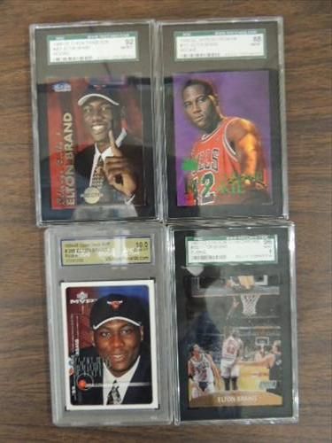 LOT 4 ELTON BRAND GRADED ROOKIE BASKETBALL CARDS: 1999-00 STADIUM CLUB #132, UPPER DECK #209, SKYBOX #101 & FLEER #203. AS SHOWN. VIEW PICTURE FOR DETAIL.