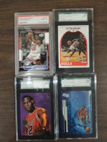 LOT 4 ELTON BRAND GRADED ROOKIE 1999 BASKETBALL CARDS: UPPER DECK #316, HOOPS #89, IONIX #61 AND SKYBOX #101. AS SHOWN. VIEW PICTURE FOR DETAIL.