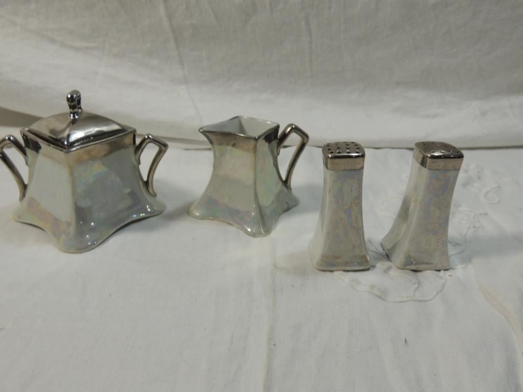 DECORATIVE CHINA, BONE CHINA, PEARLESISNCE SILVER PAINT DINNERWARE, SUGAR CREAMER SALT AND PEPPER SHAKERS AS SHOWN SEE PHOTO FOR MORE DETAILS.
