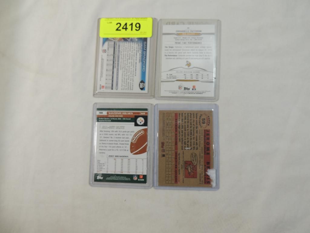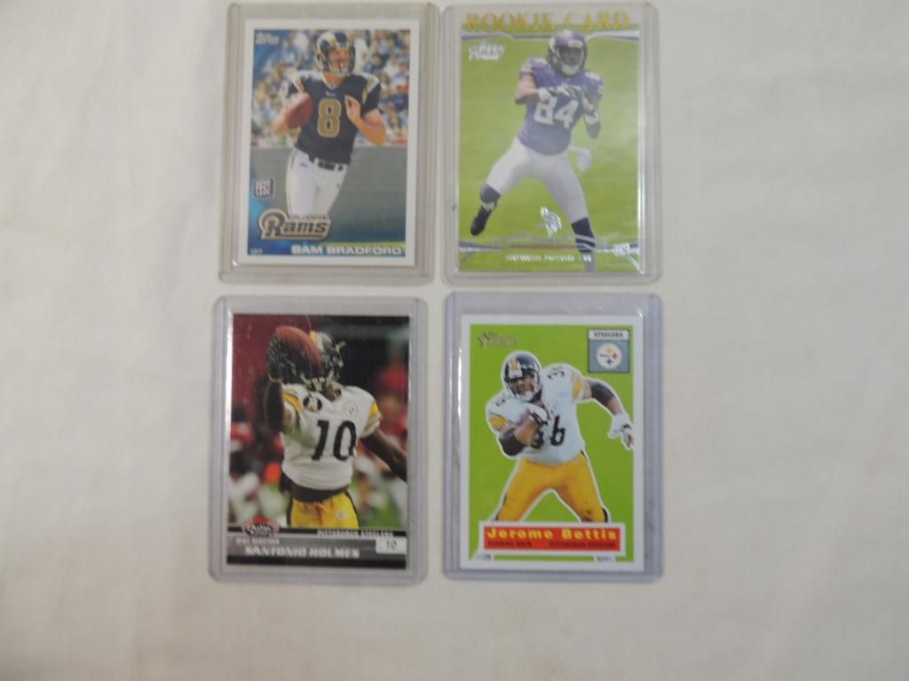 3 FOOTBALL CARDS. STEELERS JEROME BETTIS, RAMS SAM BRADFORD, STEELERS SANTONIO HOLMES, VIKINGS CORDARRELLE PATTERSON. ROOKIE CARD FOOTBALL PLAYER CARD. TRADING CARD. FOOTBALL COLLECTIBLE. CARD IN GOOD CONDITION IN PLASTIC PROTECTIVE SLEEVE. AS SHOWN. SEE