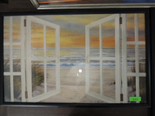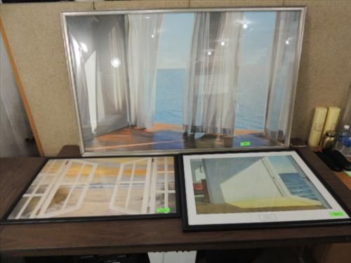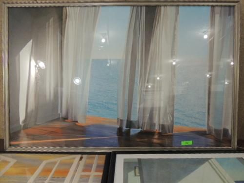 LOT 3 FRAMED CONTEMPORARY ART WINDOW BY THE SEA. DRAPES TO THE SEA (58X37), DOOR TO THE SAILBOATS (36X23), DOOR TO THE SEA (33X27) AND OCEAN VIEW (37X26) AS SHOWN. VIEW PICTURE FOR DETAIL.