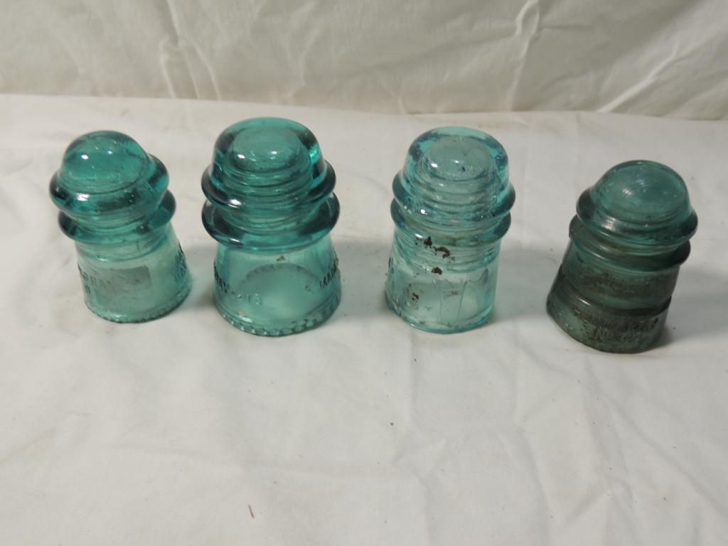 GLASS INSULATORS. VINTAGE BLUE GLASS TELEPHONE WIRE INSULATORS. AS SHOWN SEE PHOTO FOR MORE DETAILS.