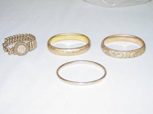 LOT (4) GOLD BRACELETS - 3 BANGLES and LOCKET STYLE;