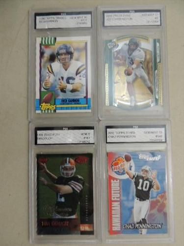LOT 4 GRADED FGS FOOTBALL PLAYER CARDS: 1990 RICH GANNON, 2002 JOEY HARRINGTON, 1999 TIM COUCH & 2000 CHAD PENNINGTON. ALL GRADED GEM MINT 10. AS SHOWN. VIEW PICTURE FOR DETAIL.