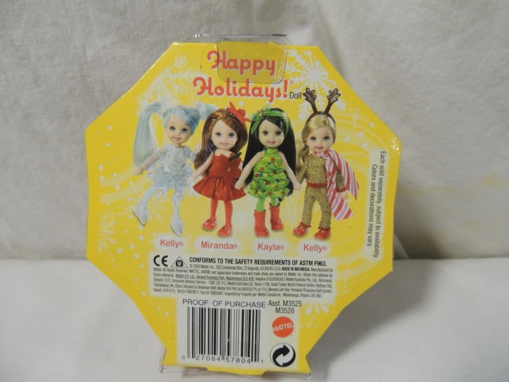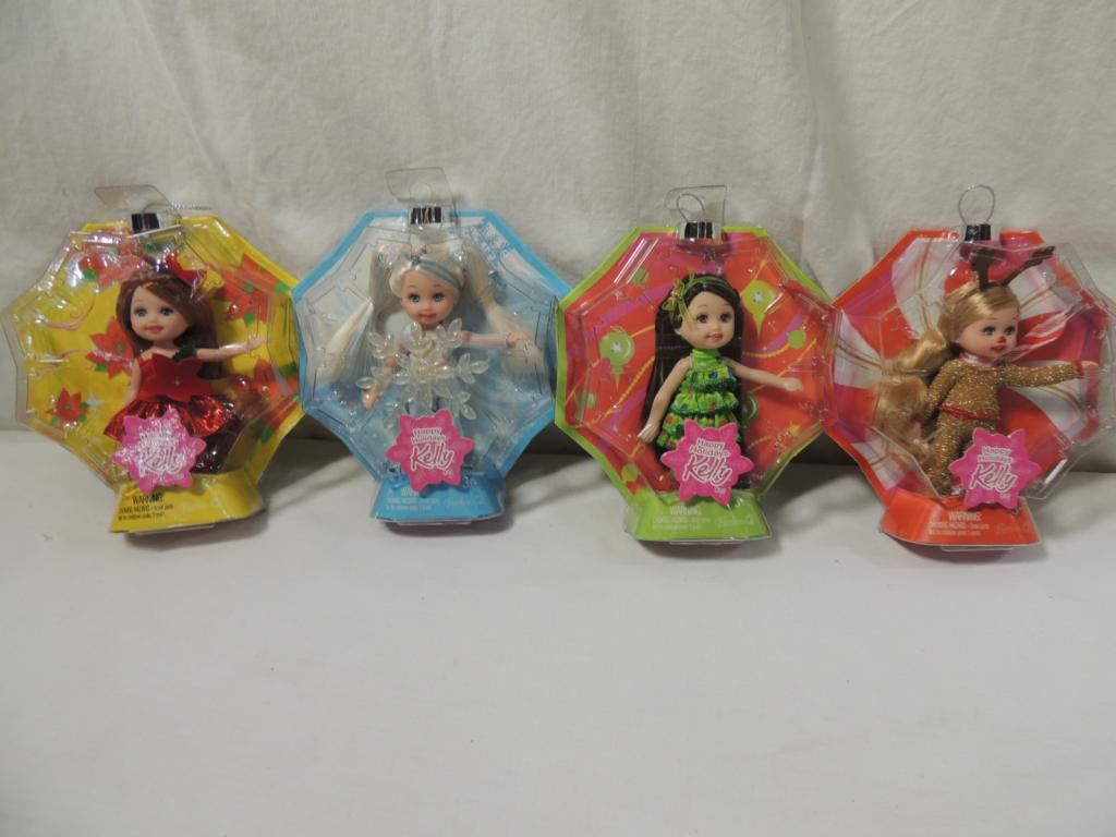 COMPLETE SET ALL FOUR HAPPY HOLIDAYS KELLY DOLLS, KELLY, MIRANDA, KAYLA, KELLY. DRESSED IN HOLIDAY OUTFITS, SMALL DOLLS, BARBIES SISTER DOLLS, MATTEL NEW NEVER OPENED, COLLECTIBLE, GREAT CONDITION AS SHOWN SEE PHOTO FOR MORE DETAILS.