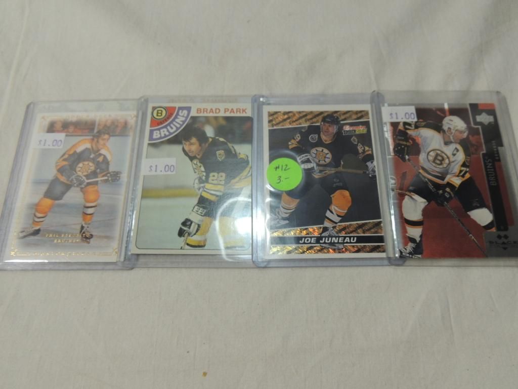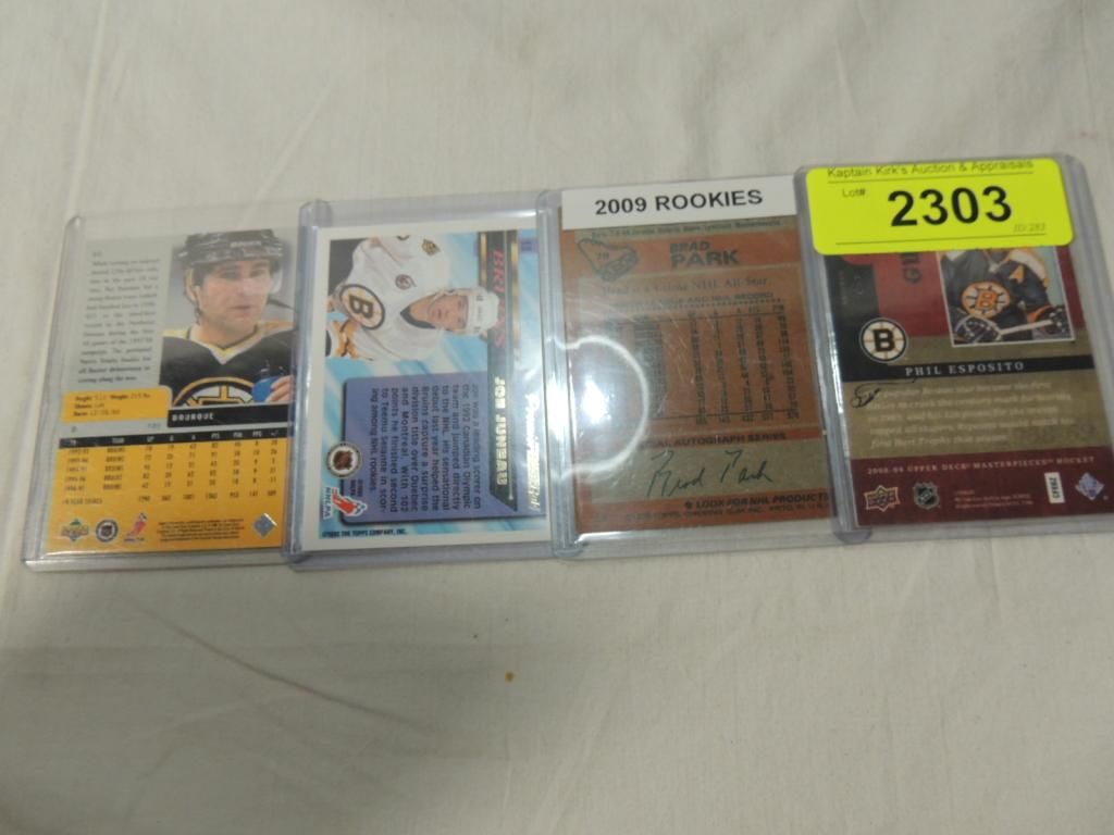 1978 TOPPS BRAD PARK, UPPER DECK BRUINS BLACK DIAMOND CARD, PRIEMER JOE JUNEAU, 2008 UPPER DECK MASTERPIECES PHIL ESPOSITO. TARDING CARDS GREAT CONDITION. IN PLASTIC SLEEVE. AS SHOWN. SEE PHOTO FOR MORE DETAILS