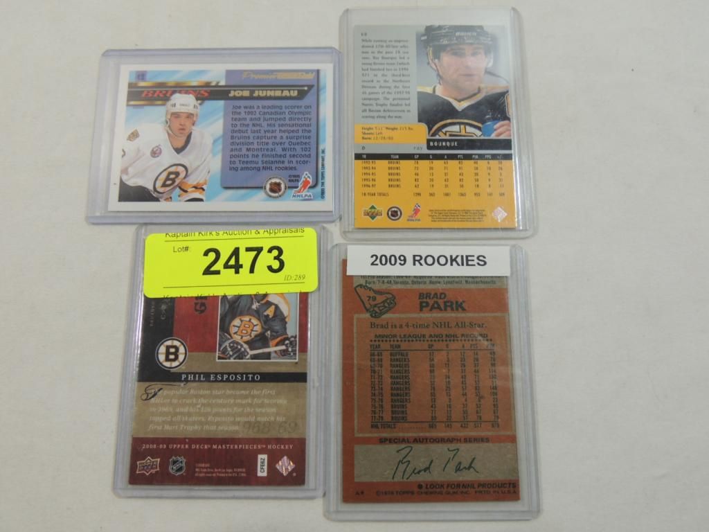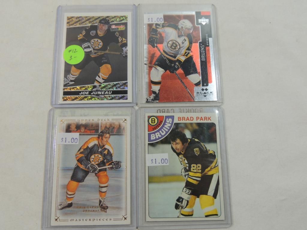 1978 TOPPS BRAD PARK, UPPER DECK BRUINS BLACK DIAMOND CARD, PRIEMER JOE JUNEAU, 2008 UPPER DECK MASTERPIECES PHIL ESPOSITO. TARDING CARDS GREAT CONDITION. IN PLASTIC SLEEVE. AS SHOWN. SEE PHOTO FOR MORE DETAILS