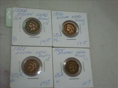 LOT OF 4 INDIAN HEAD CENTS INCLUDING YEARS: 1881, 1888, 1896, AND 1905. AS SHOWN. VIEW PICTURE FOR DETAIL.