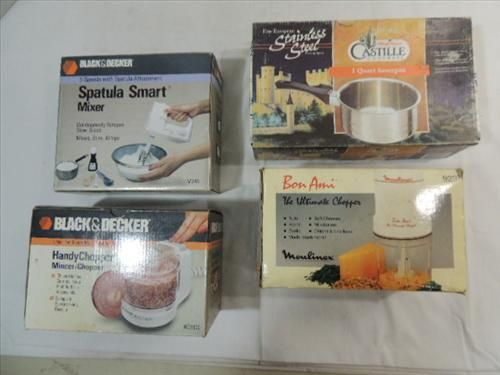 LOT 4 KITCHEN TOOLS: BLACK & DECKER FOOD CHOPPER & MIXER, BON AMI FOOD CHOPPER, CASTILLE SAUCEPAN. AS SHOWN. VIEW PICTURE FOR DETAIL.