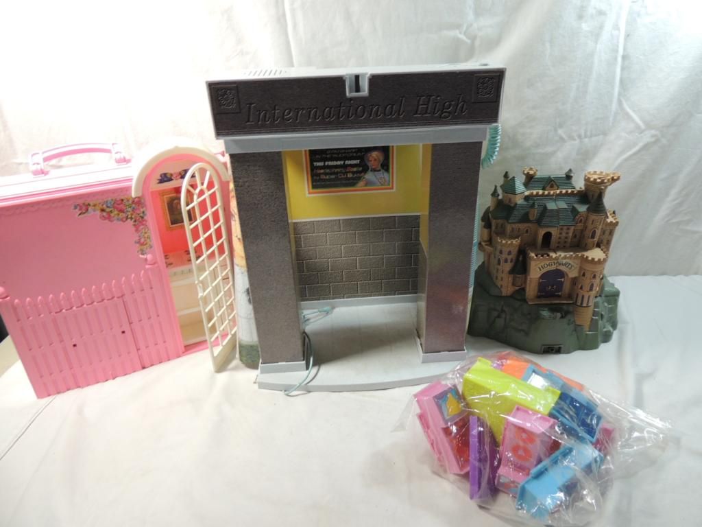 LOT 4 LARGER DOLL PLAY SETS: BARBIE, RAVE & HOG WART CASTLE. AS SHOWN. VIEW PICTURE FOR DETAIL.