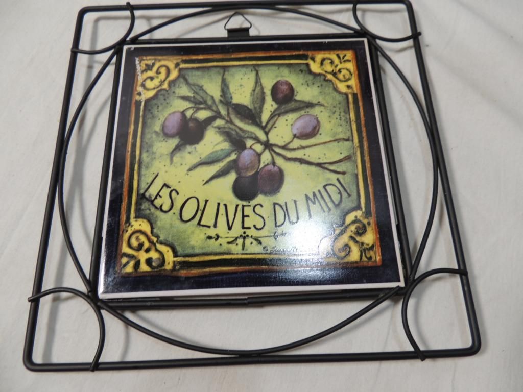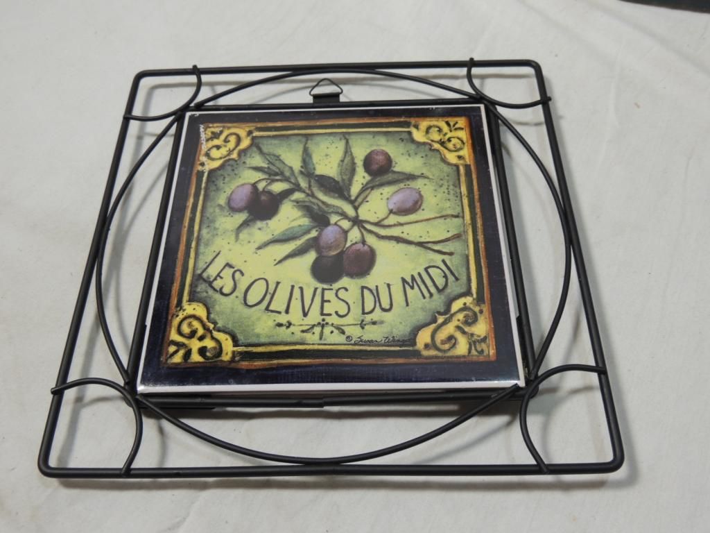CERAMIC AND MEDAL WIRE TRIVET WITH LES OLIVES DU MIDI TRIVET. OLIVES ON CERAMIC TILE. AS SHOWN. SEE PHOTO FOR MORE DETAILS. NEW IN BOXES.
