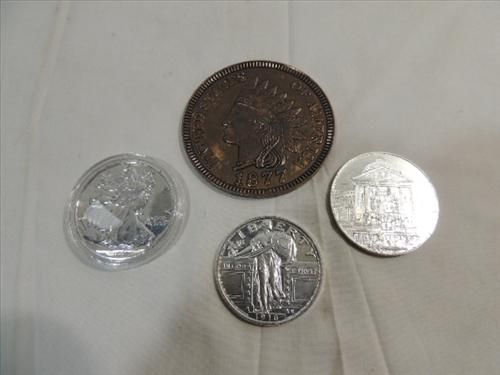 LOT 4 MEDALLIONS - OVER SIZED COIN REPLICAS. INDIAN HEAD PENNY, WALKING LIBERTY & STANDING LIBERTY. AS SHOWN. VIEW PICTURE FOR DETAIL.