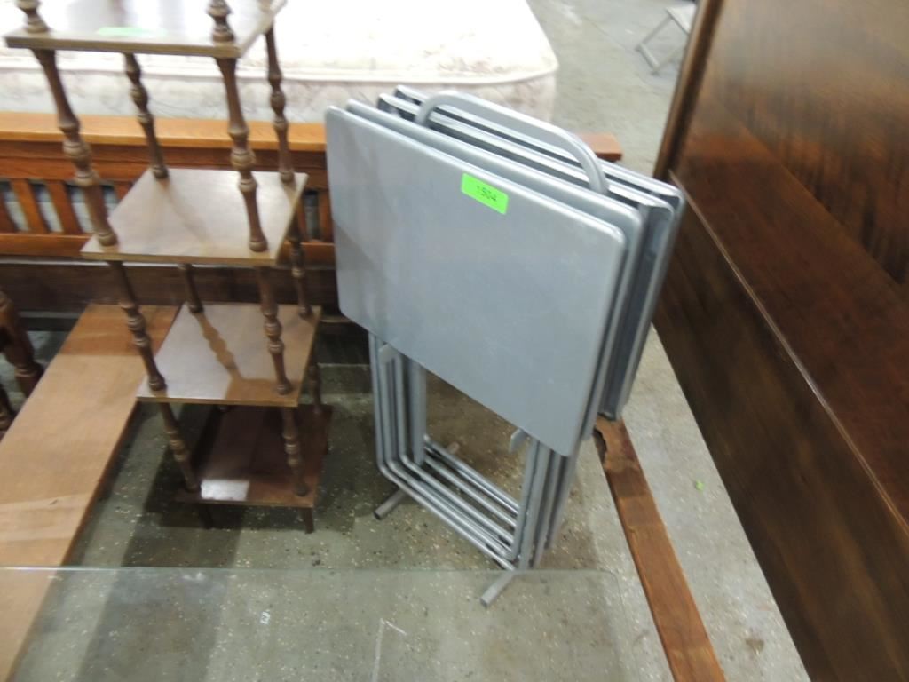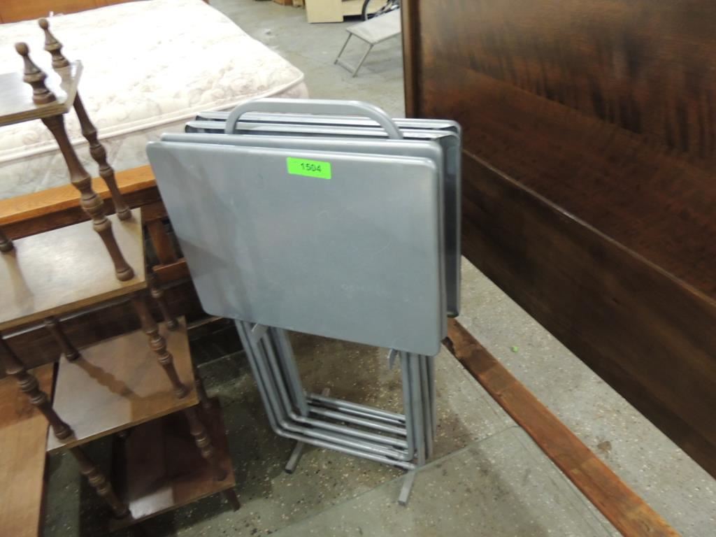 DECORATIVE SILVER METAL TV TRAYS WITH STAND, STORAGE, FOLDING TRAYS AS SHOWN SEE PHOTO FOR MORE DETAILS.