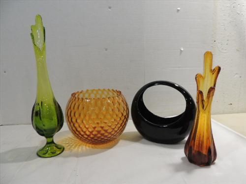 LOT 4 MID CENTURY MODERN GLASS & CERAMIC DECORATIVE VASES & PLANTER. AS SHOWN,. VIEW PICTURE FOR DETAIL.