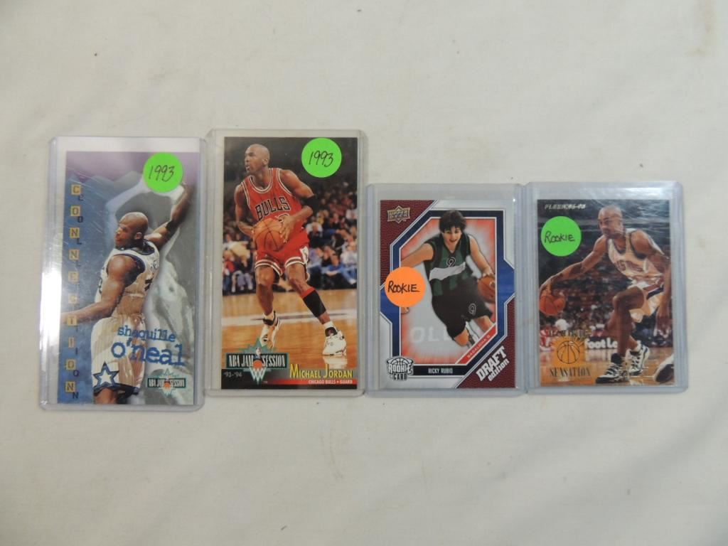 SHAQUILLE ONEAL, MICHAEL JORDAN, GRANT HILL, RICKY RUBIO, BASKETBALL PLAYER CARD. TRADING CARDS. COLLECTIBLE. PROTECTIVE PLASTIC SLEEVE. GOOD CONDITION. BASKETBALL MEMORABILIA. AS SHOWN. SEE PHOTO FOR MORE DETAILS.