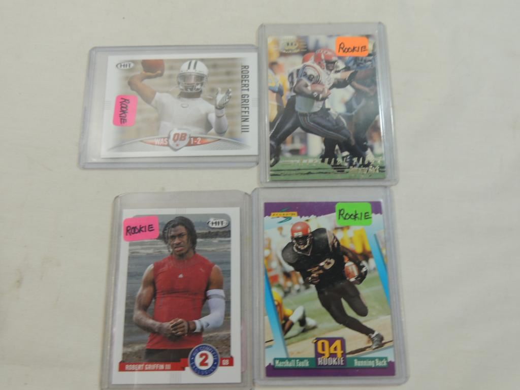 MARSHALL FAULK & ROBERT GRIFFIN III MIXED MAKERS AND MIXED DATES. FOOTBALL PLAYER CARDS. TRADING CARDS. FOOTBALL COLLECTIBLE. GOOD CONDITION. PROTECTIVE SLEEVES. SPORTS FOOTBALL MEMORABILIA. AS SHOWN SEE PHOTO FOR MORE DETAILS.