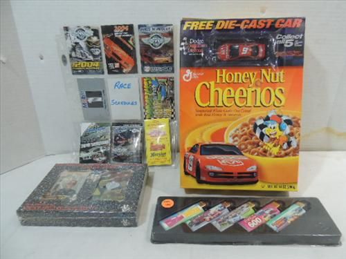 LOT 4 NASCAR PROMO COLLECTIBLES: CHEERIOS BOX WITH DIE CAST METAL NASCAR, 8 RACE SCHEDULES, 5 CIGARETTE LIGHTER & 1993 PRESSPASS COLLLECTOR CARDS. AS SHOWN. VIEW PICTURE FOR DETAIL.