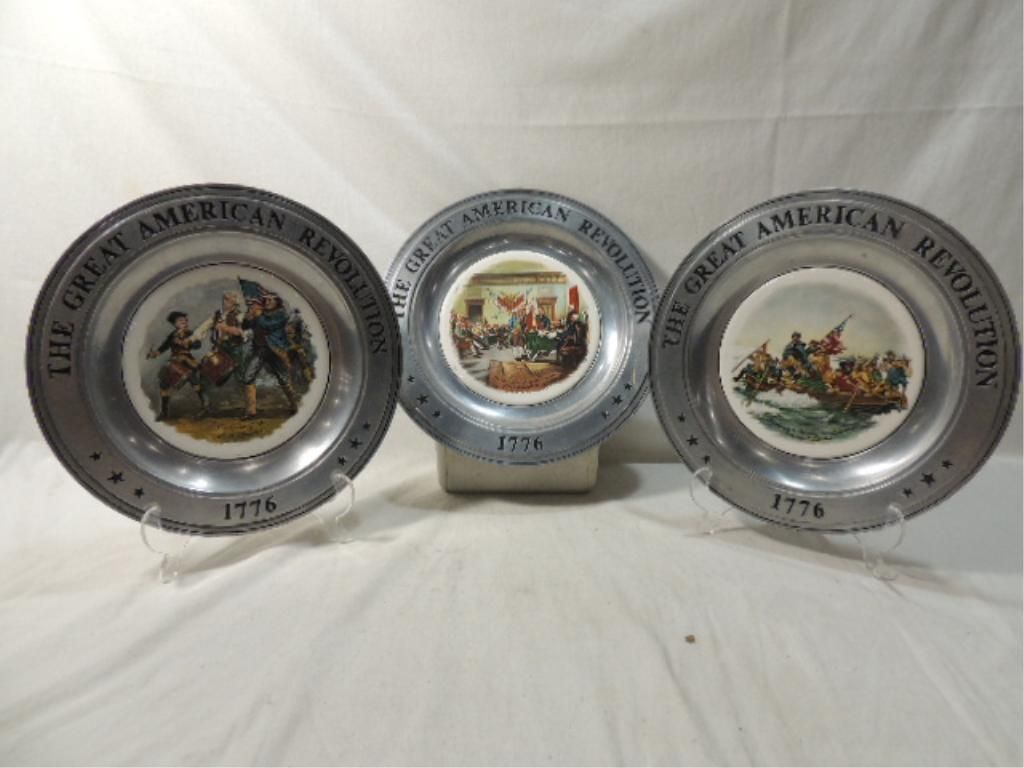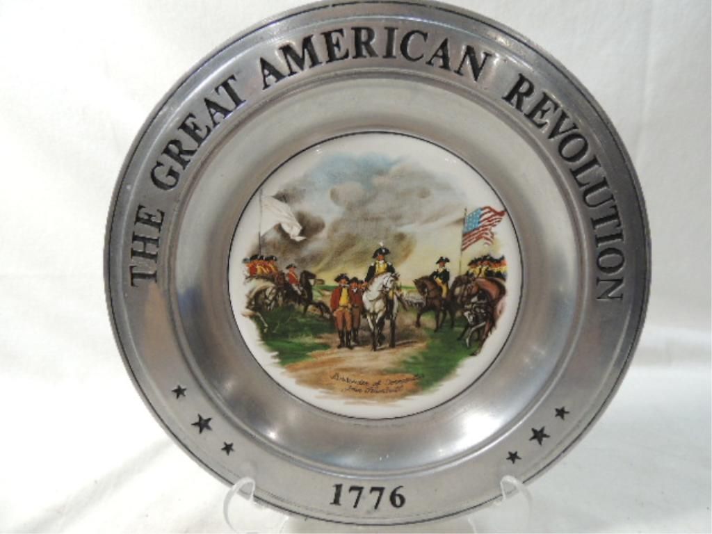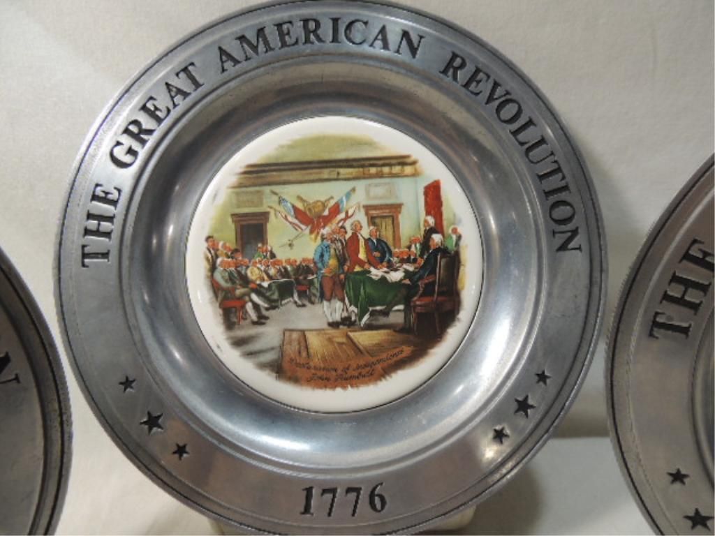 CANTON PEWTER THE GREAT AMERICAN REVOLUTION 1776 VINTAGE PATRIOTIC PEWTER PLATES. THE SPIRIT OF 76, WASHINGTON CROSSING THE DELAWARE, DECLARATION OF INDEPENDENCE, SURRENDER OF CORNWALLIS. AS SHOWN SEE PHOTO FOR MORE DETAILS.