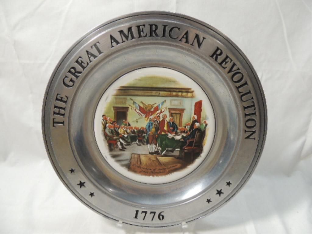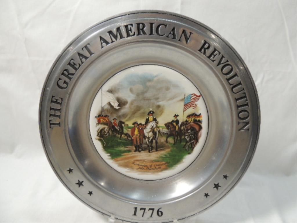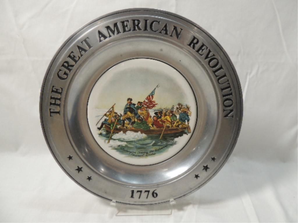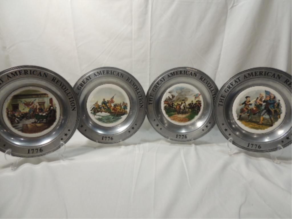 CANTON PEWTER THE GREAT AMERICAN REVOLUTION 1776 VINTAGE PATRIOTIC PEWTER PLATES. THE SPIRIT OF 76, WASHINGTON CROSSING THE DELAWARE, DECLARATION OF INDEPENDENCE, SURRENDER OF CORNWALLIS. AS SHOWN SEE PHOTO FOR MORE DETAILS.