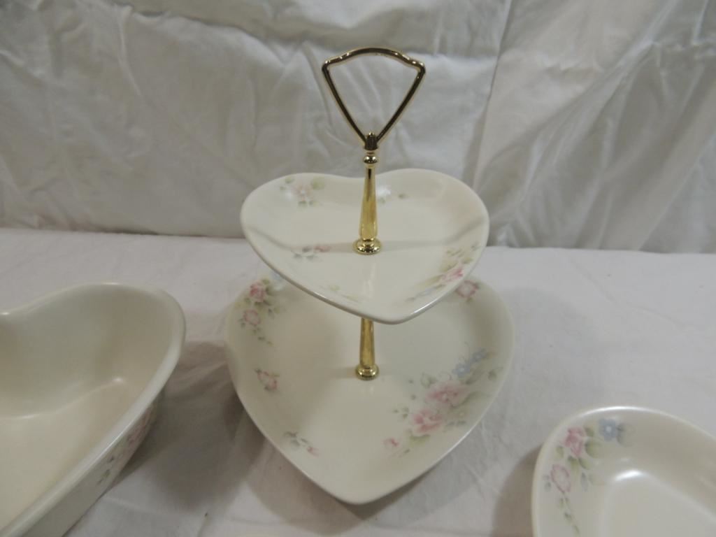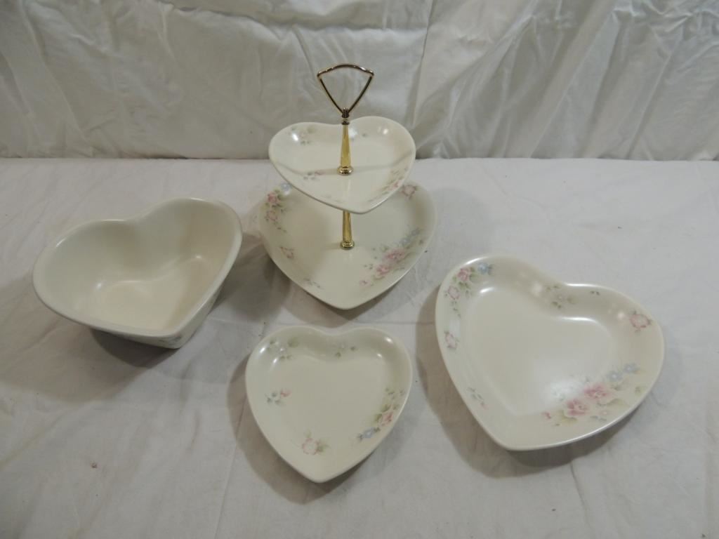 HEART SERVING BOWL, HEART TIERED DISPLAY PLATTER, HEART PLATTER, SMALL HEART PLATE PFALTZGRAFF COLLECTIBLE DINNERWARE, STONEWARE, COLLECTORS DISHES, POPULAR DESIGN, FLORAL PATTERN, TEA ROSE PATTERN, WEDDING SET, AS SHOWN SEE PHOTO FOR MORE DETAILS