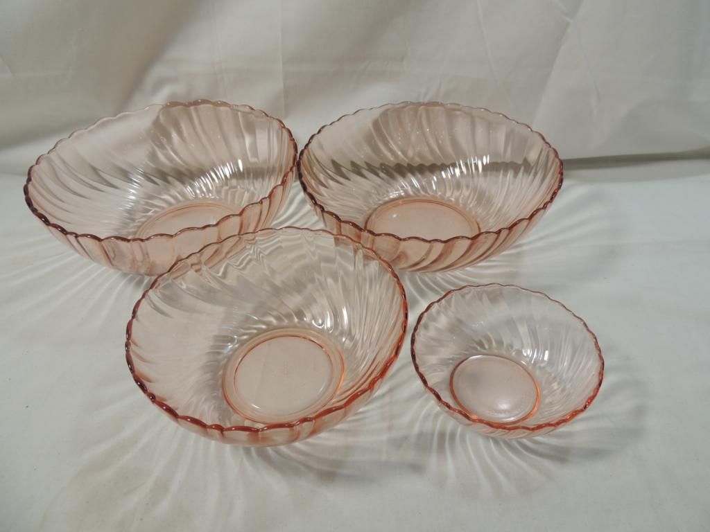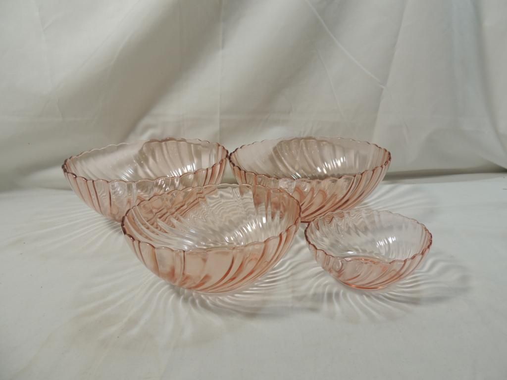 PINK DEPRESSION GLASS BOWLS. SWIRL DESIGN. AS SHOWN. SEE PHOTO FOR MORE DETAILS.