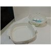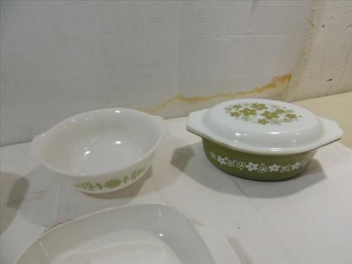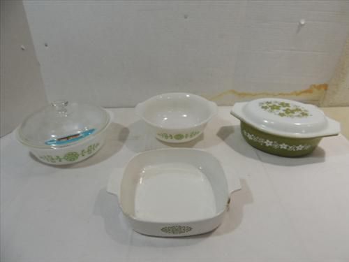 LOT 4 PYREX COOKING CASSAROLE DISHES, 2 WITH LIDS. AS SHOWN. VIEW PICTURE FOR DETAIL.