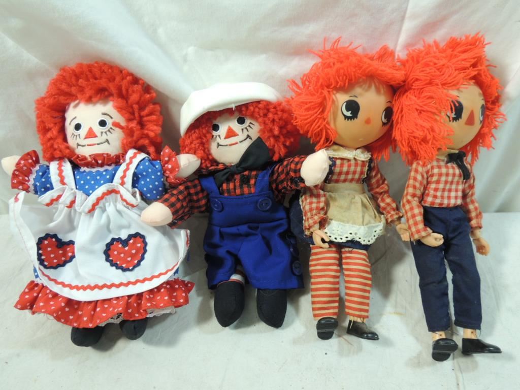 RAGGEDY ANN & ANDY DOLLS COLLECTIBLE DOLLS, VINTAGE DOLLS, COLLECTORS DOLLS, DESIGNER DOLLS, GOOD CONDITION, AS SHOWN SEE PHOTO FOR MOER DETAILS.