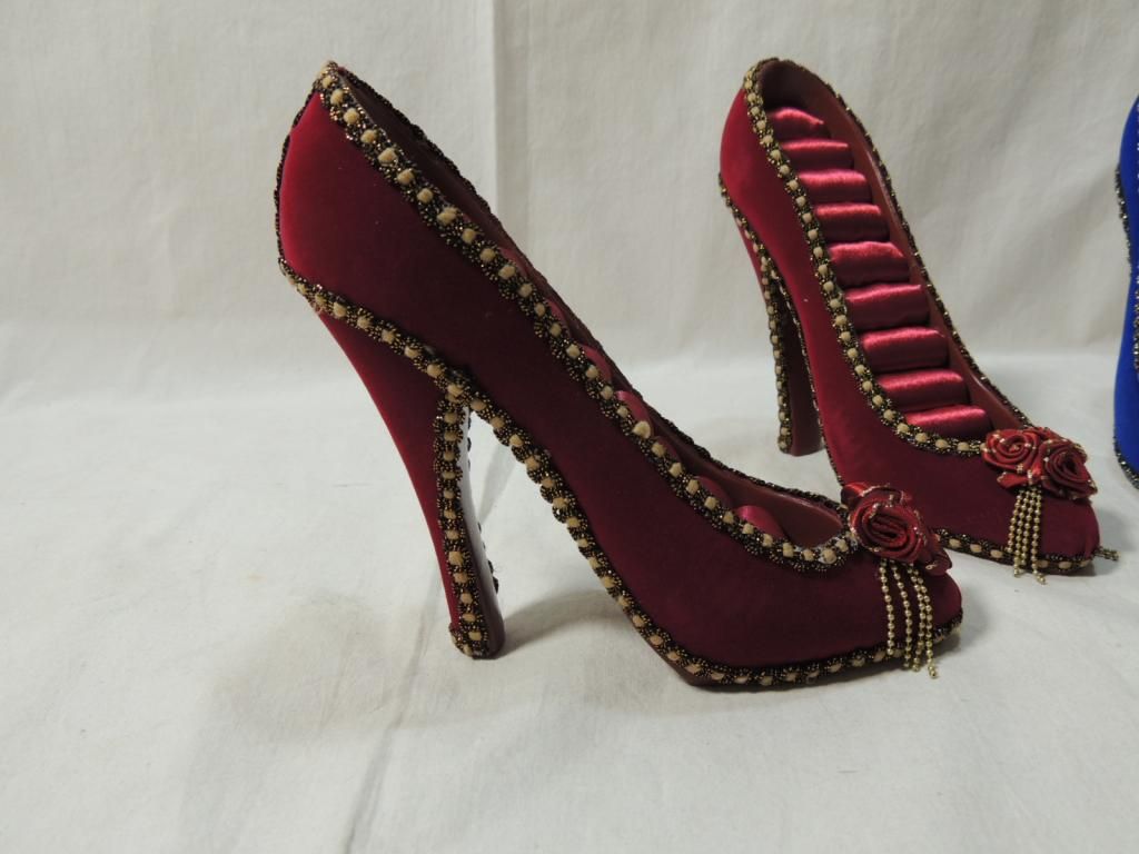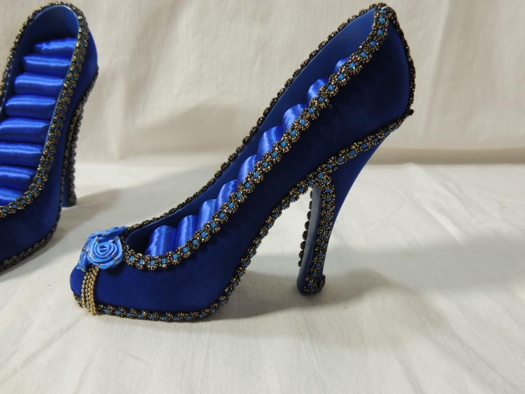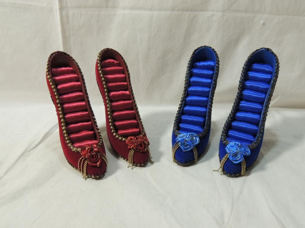 RING HOLDER SHOE. ASSORTED COLORS. BLUE, RED. VELVET DECORATIVE RING HOLDER. AS SHOWN. SEE PHOTO FOR MORE DETAILS.