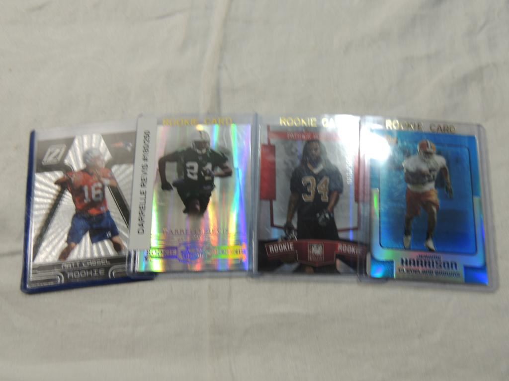 JEROME HARRISON, PATRICK ROBINSON, DARRELLE REVIS, MATT CASSEL FOOTBALL PLAYER CARDS. TRADING CARDS. COLLECTIBLE. FOOTBALL MEMORABILIA. GOOD CONDITION AS SHOWN. SEE PHOTO FOR MORE DETAILS.
