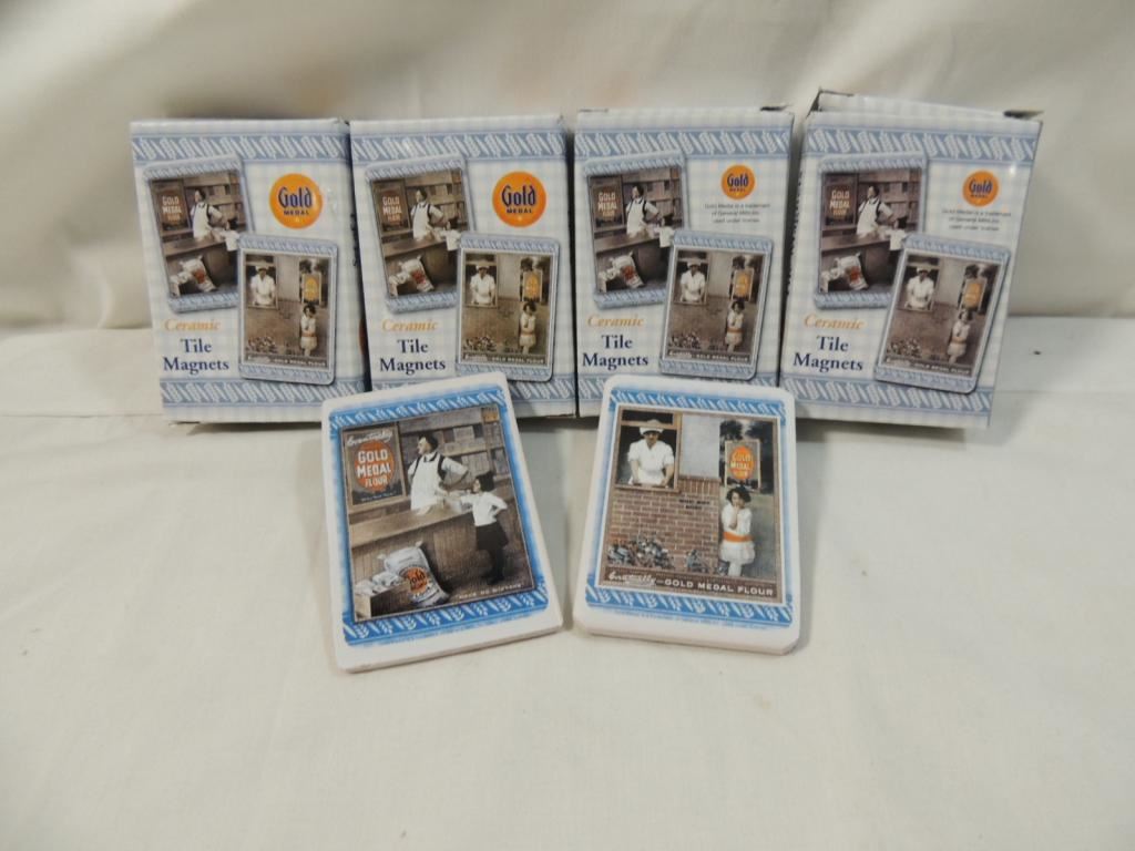 GOLD MEDAL FLOUR CERAMIC TILE MAGNETS. 4 BOXES. EACH BOX CONTAINS 2 MAGNETS AS SHOWN. SEE PHOTO FOR MORE DETAILS.