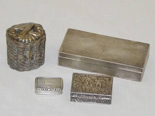 LOT (4) SILVER BOXES: (3) CONTINENTAL & (1) TALC BOX W/ LONDON ENGLAND HALLMARKS-J.W. MAKER (LG.= 3 1/2", SMALL= 1 1/8" (TALC) ) - WEAR & IMPERFECTIONS