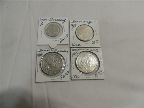 LOT 4 SILVER HIG VALUE (3) GERMAN (1909A 1 MARK, 1861 VEREINSTHALER, 1965 5 MARK, NEDERLANDS COINS. AS SHOWN. VIE WPICTUR EFOR DETAIL.