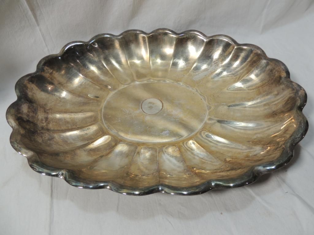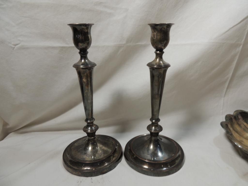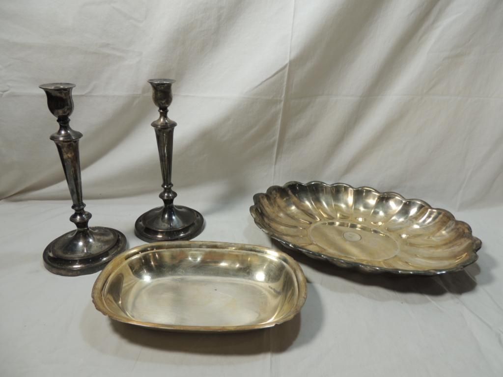 TWO SILVERPLATE TRAYS HEAVY SILVERPLATE. WITH TWO TALL CANDLESTICKS. SILVER PLATE CANDLE STICKS. DECORATIVE TABLEWARE. SERVING DISHES. TRAYS. AS SHOWN. SEE PHOTO FOR MORE DETAILS.