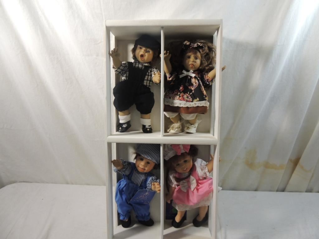 COLLECTORS DOLLS, BABY DOLLS, SMALL 12" DOLL WOODEN DISPLAY BOX CASE, 4 DOLLS, AS SHOWN SEE PHOTO FOR MORE DETAILS