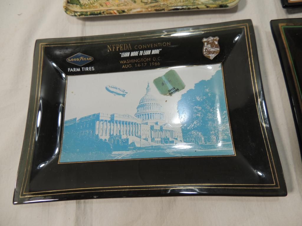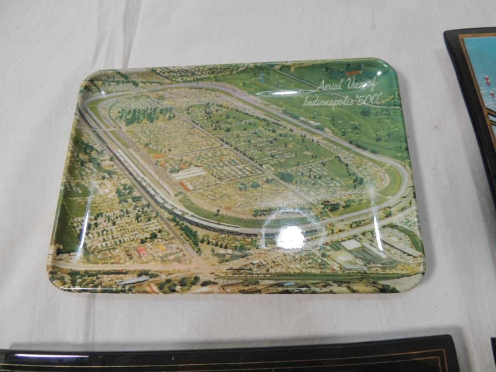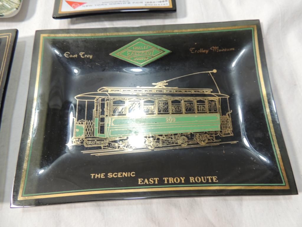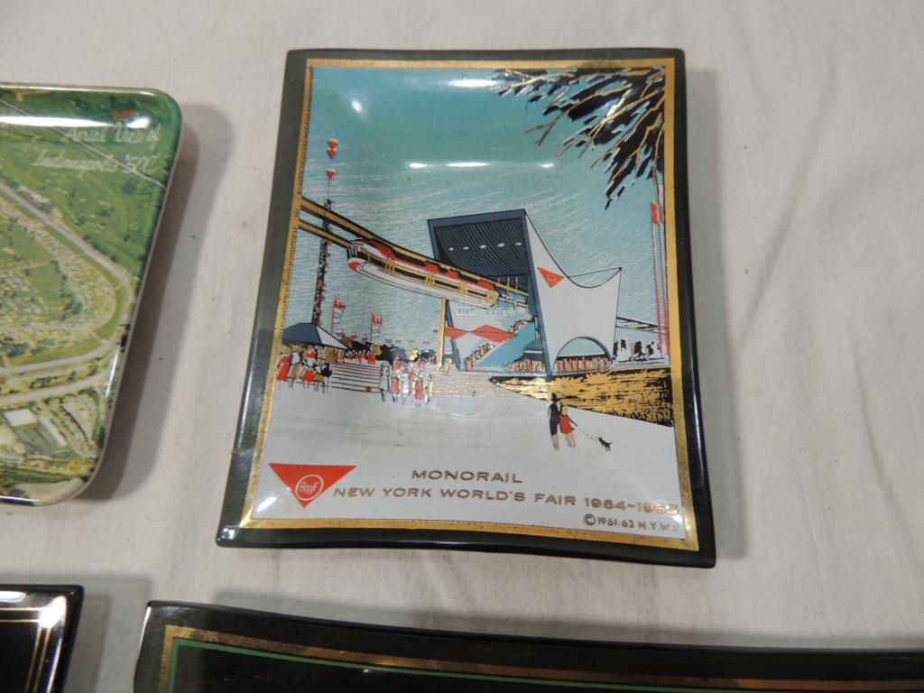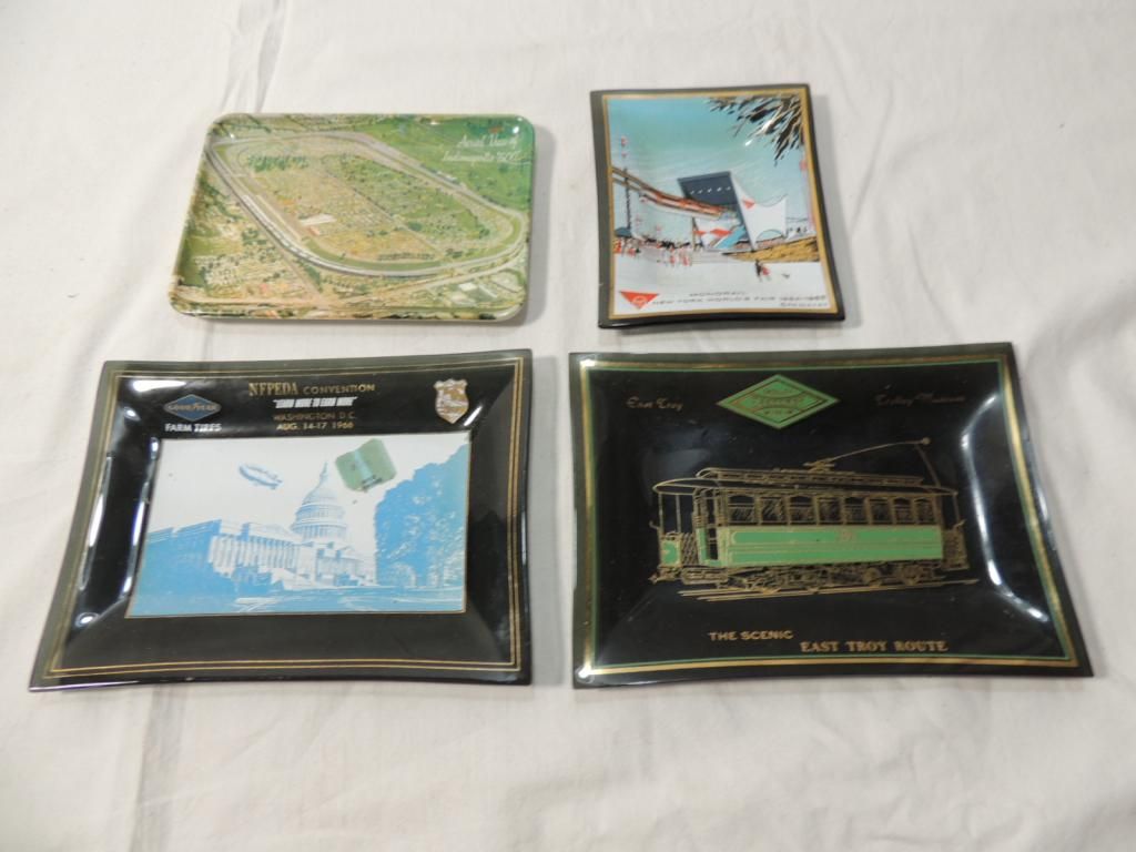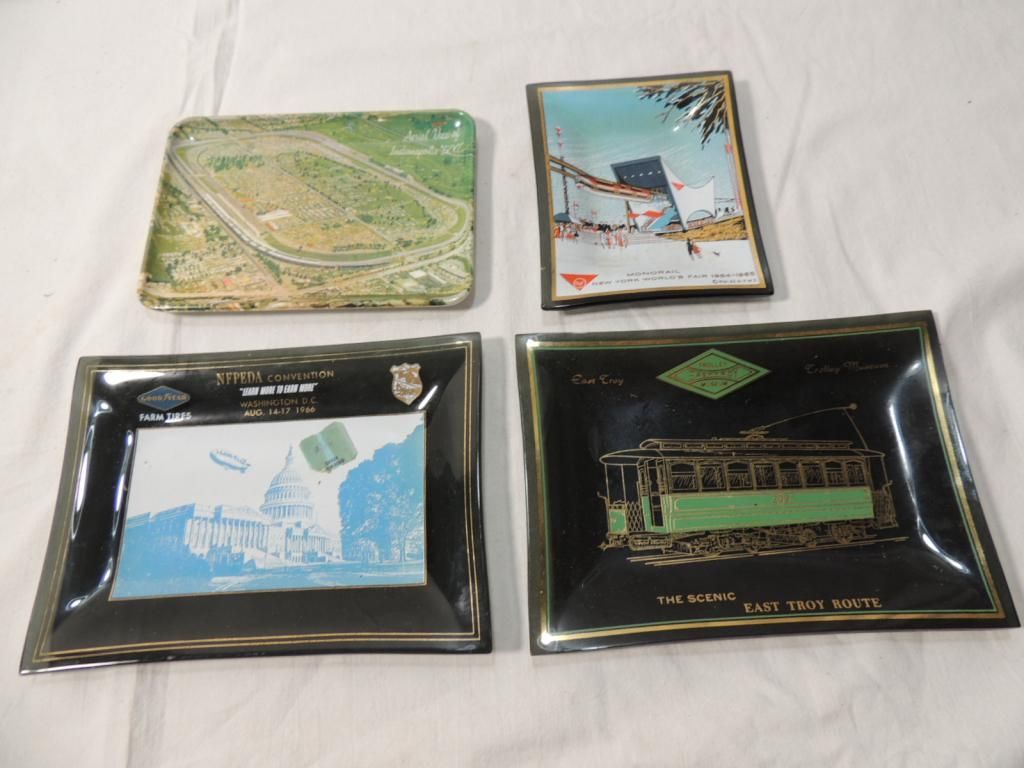 WORLDS FAIR 1964-1965. INDIANAPOLIS 500, EAST TROY TROLLEY MUSEUM, NFPEDA CONVENTION. SMALL TRAYS GLASS TRAYS. VINTAGE SOUVENIR. TRAVEL, EVENT, PROMOTIONAL. AS SHOWN. SEE PHOTO FOR MORE DETAILS.