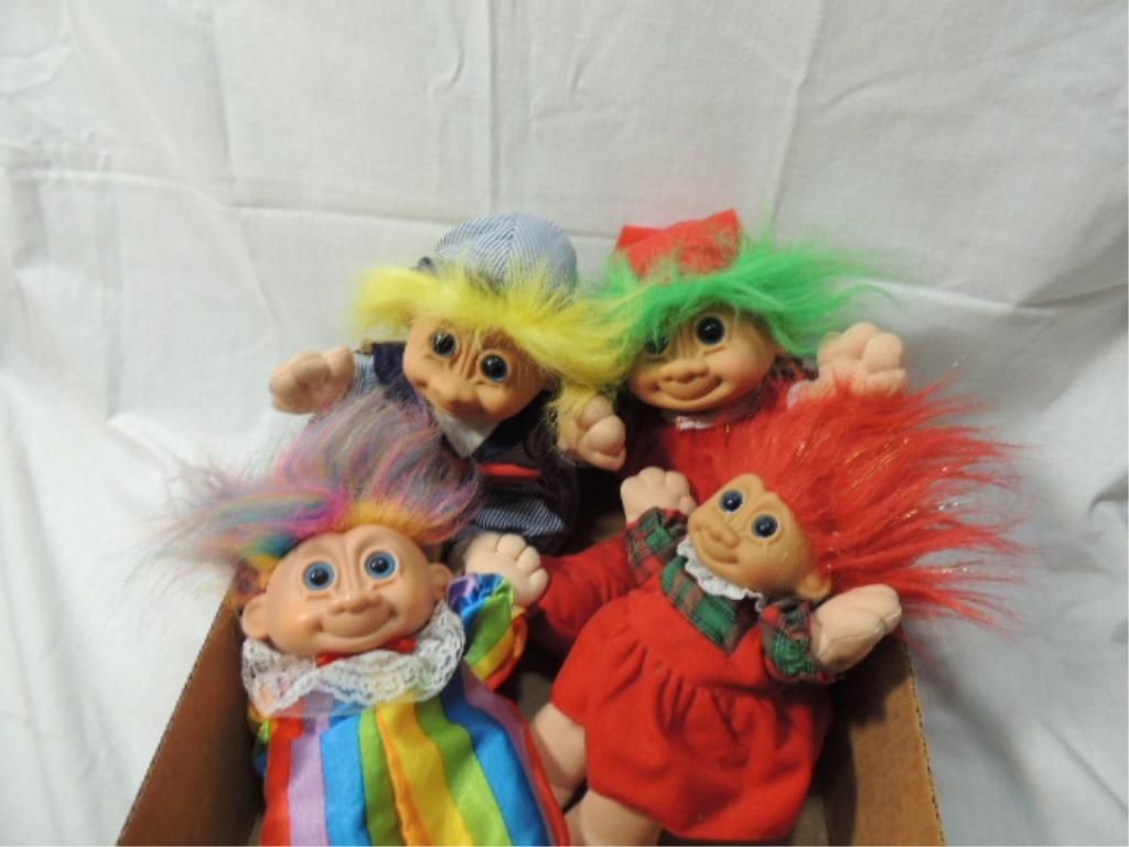 4 TROLL DOLLS WITH RUBBER FACES, AND CLOTH BODIES, AS SHOWN.